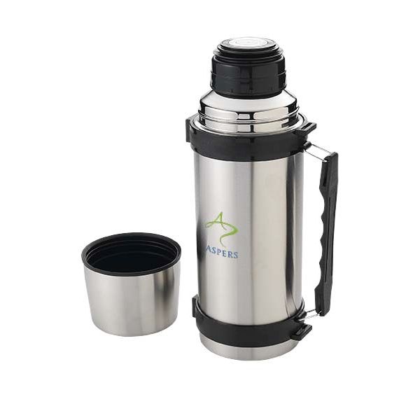 Everest isolating flask with strap. Double walled stainless steel isolating flask with handle and nylon strap which can be attached to the flask for easy transport. The large capacity of 1L makes this flask ideal for outdoor activities. The cap can be used as a mug. Presented in a gift box. . Stainless steel interior and exterior.