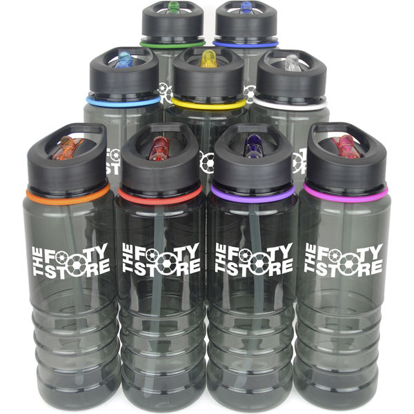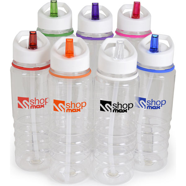 750ml single walled, transparent, PET plastic drinks bottled with white PP plastic lid, clear PE plastic straw, coloured band and AS plastic coloured fold down sip mouth piece. BPA & PVC free. Available in 11 colours.