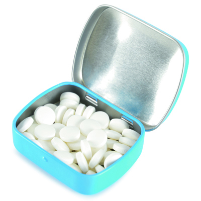 Rectangular shaped metal container with approx. 64 mints per tin. Ingredients sticker and seal included.