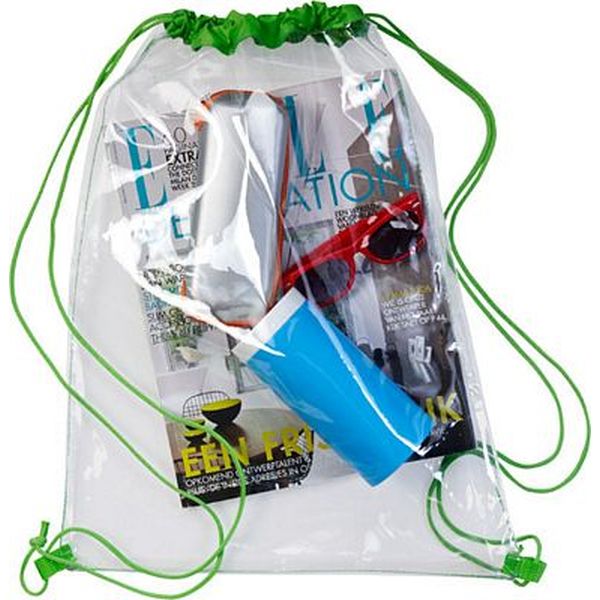 Transparent PVC drawstring bag with coloured trim and straps.