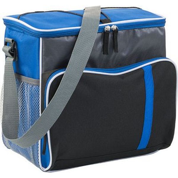 Cooler bag in a 600D polyester material with a front zipped pocket, two side mesh pockets and adjustable shoulder strap.
