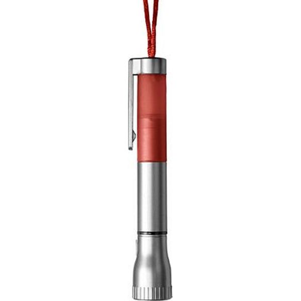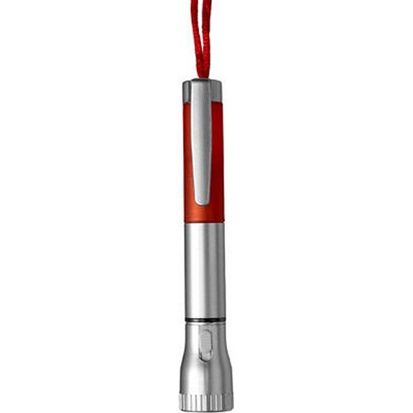 Plastic ballpen with blue ink and LED torch with coloured cord.