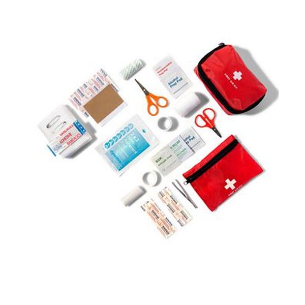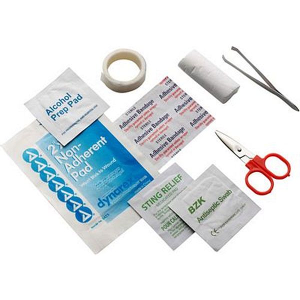 First aid kit supplied in a nylon pouch with a belt clip attachment, consisting of tweezers, one tape, one role bandage, two adhesive sterile bandages, one small alcohol pad, one sting relief medicated pad, one antiseptic swab, one pair of scissors.