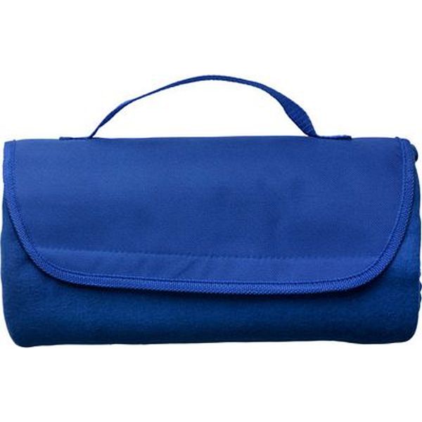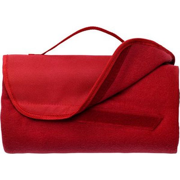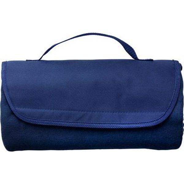 Fleece travel blanket with nylon carrying handle, unfolded size 133 x 120 cm.