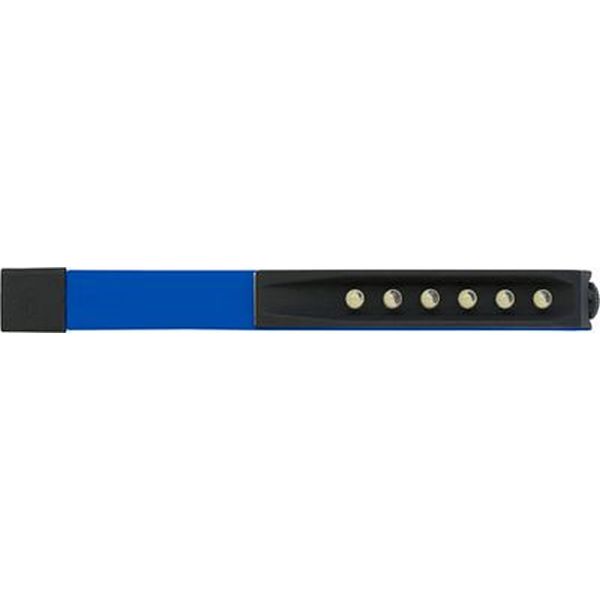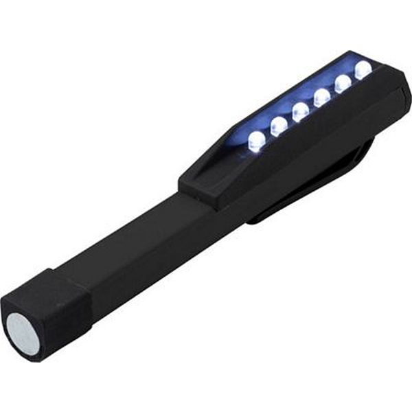 Pen shaped pocket torch with six white LED lights and a magnet on the back.