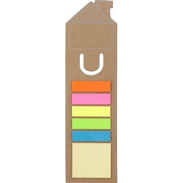 House shaped bookmark made from card with five different coloured sticky page memos, a 15 sheet sticky note pad, and a ruler.