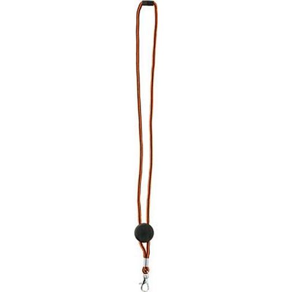 Nylon lanyard with metal carabiner clip, safety closure and plastic disc for printing or doming purposes.