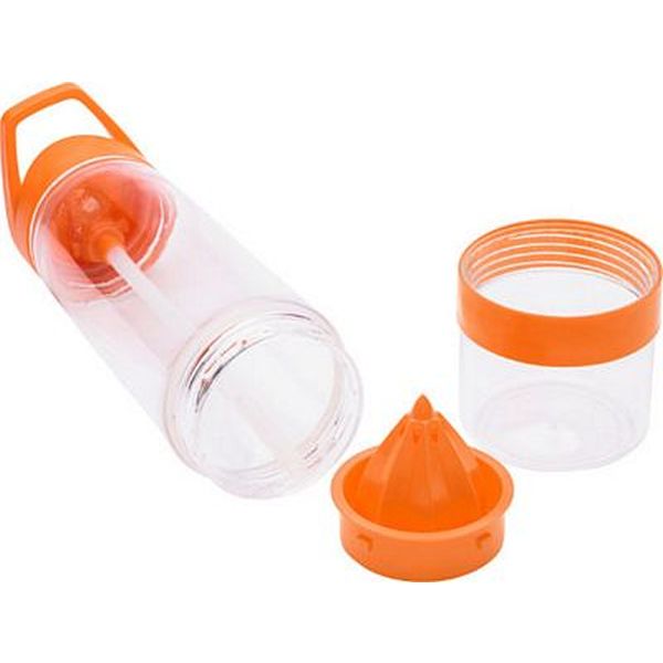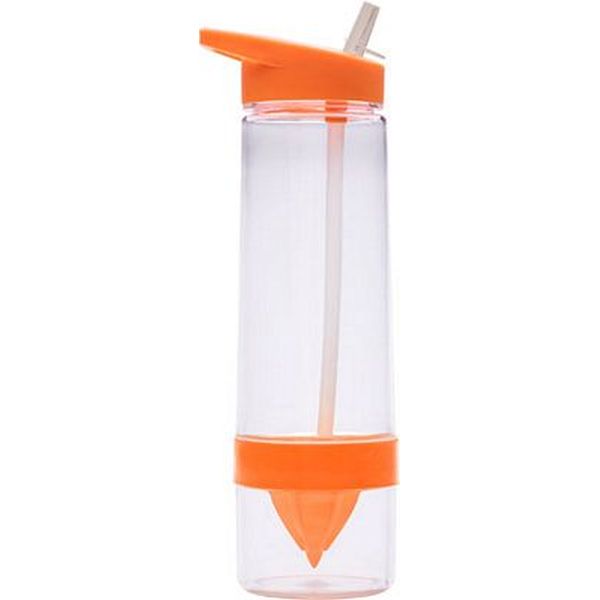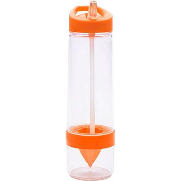 Tritan plastic water bottle with a citrus squeezer at the base and folding drinking straw. 750 ml capacity.