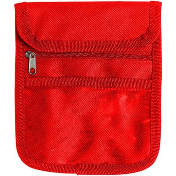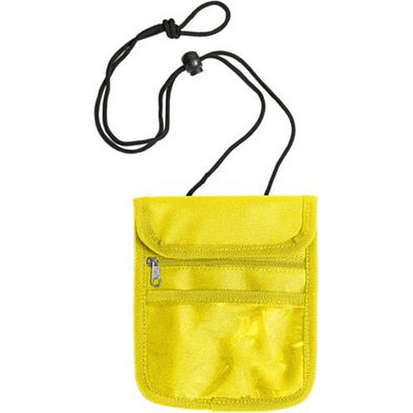 Polyester 600d wallet with a zipped pocket and a neck cord with safety release.