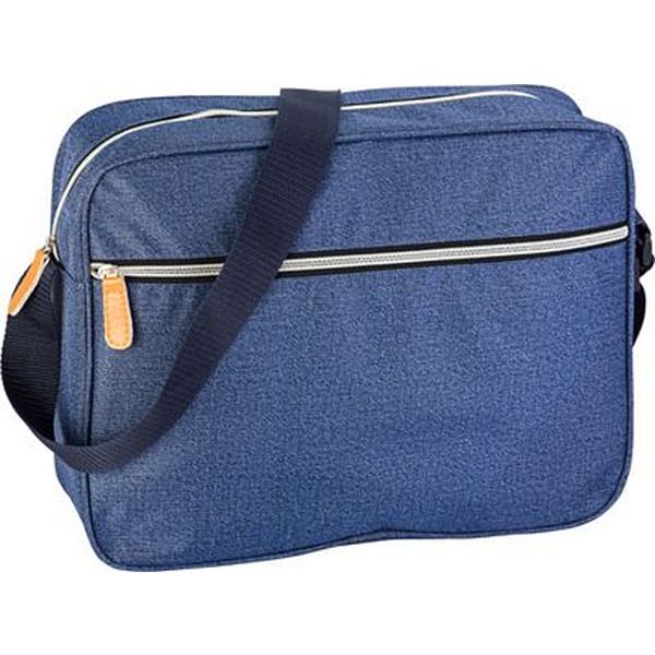 Polyester (300D) laptop bag in denim look with one large zipped front pocket, one large soft padded main compartment and one adjustable carry strap ( approx. 3.7 x 14 cm).