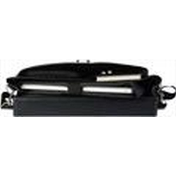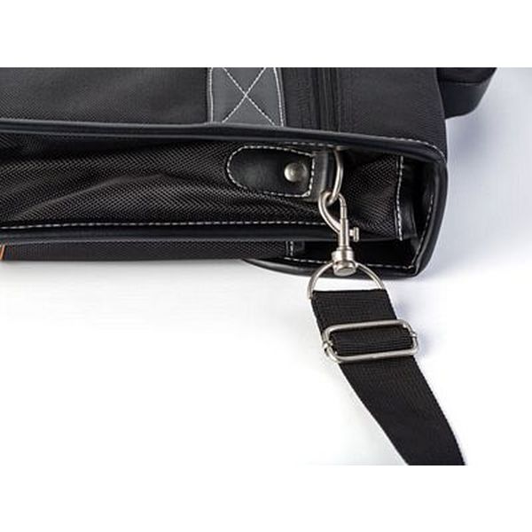 Polyester (1680D) laptop bag with a PU lid to be closed by a lock, a large padded compartment, different pockets, and a band on the back so the bag can be placed on the handle of a trolley.