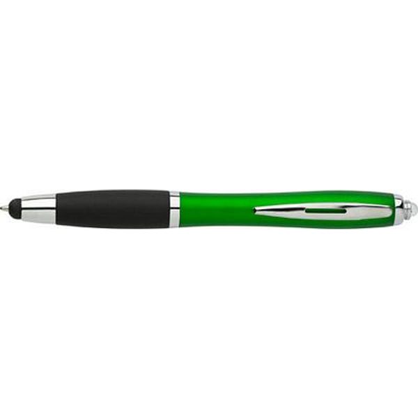 Plastic ballpen with a soft rubber grip, blue ink, metal clip, a stylus suitable for capacitive screens and a small light.