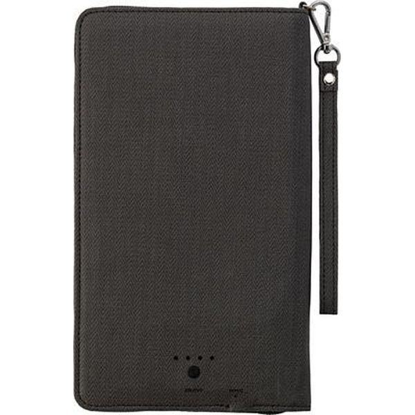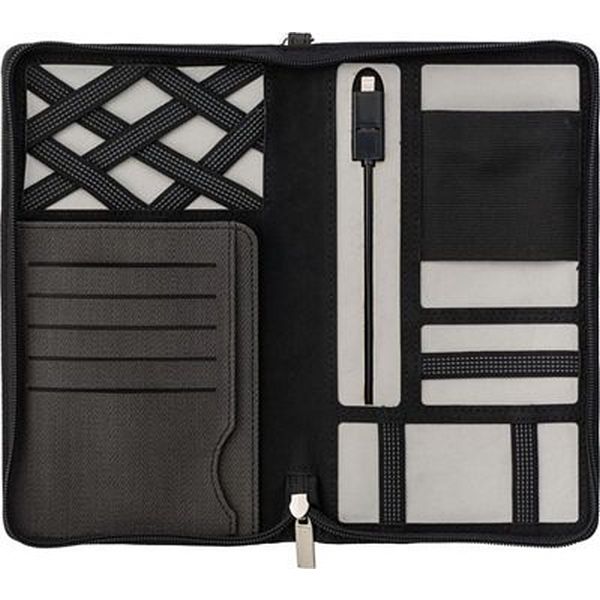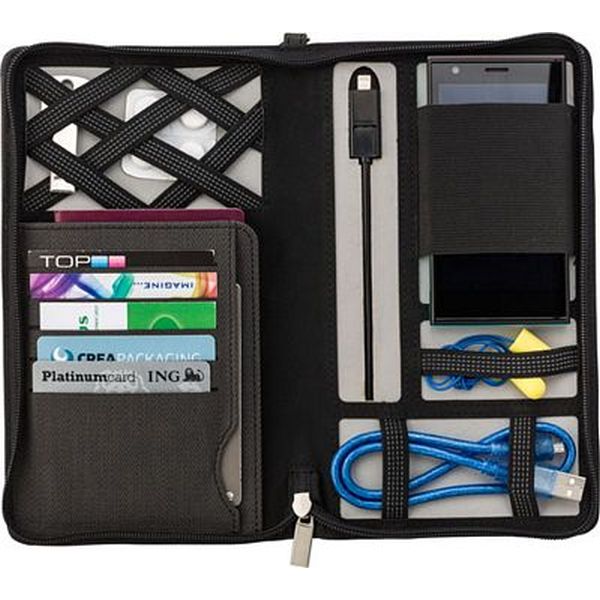 Svepa PU zippered travel wallet with integrated 4000mAh power bank, a front pocket, rubber bands for holding small items, and different pockets, a cable with a 2-in-1 connector suitable for a micro USB and other phones.