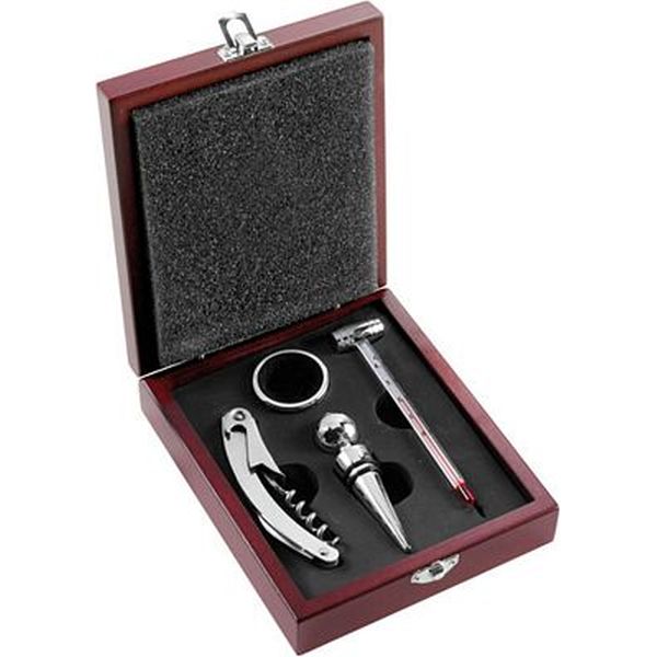 Four piece wine set supplied in a deluxe wooden gift box, includes a waiters friend, temperature gauge, bottle stop and a drip neck collar.