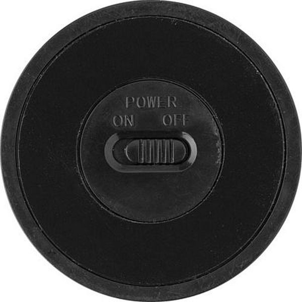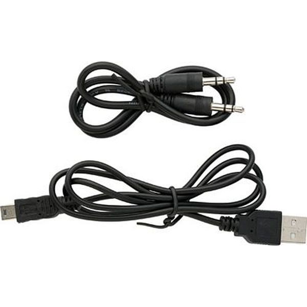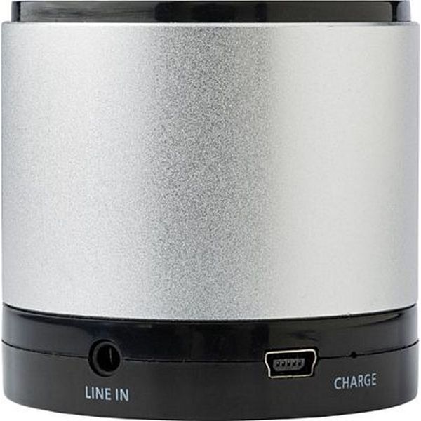 Aluminium bluetooth speaker with a line-in cable and USB cable, a microphone input and on/off switch.