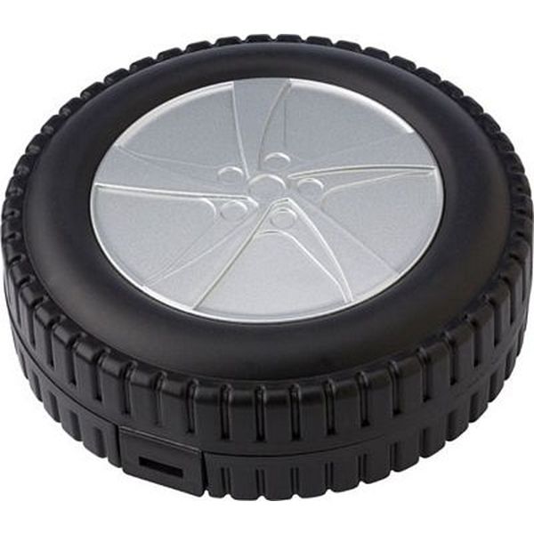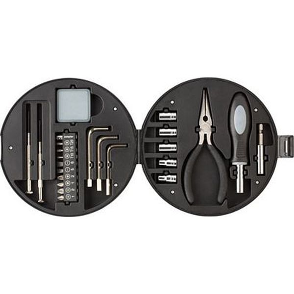 25pc Tool set, supplied in a plastic wheel shaped case and includes, pliers, a 1 meter tape measure, 5 sockets, 2 screwdrivers, 3 Allen keys and 10 screw bits.