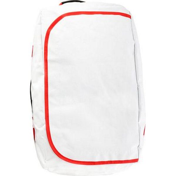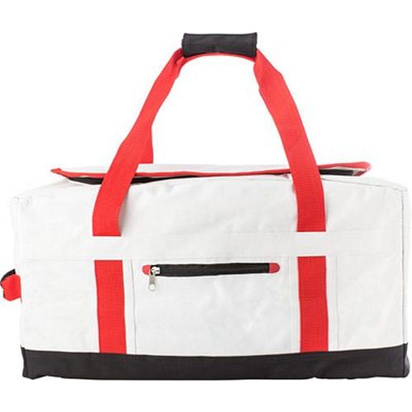 Polyester 600D travel bag/backpack with a large zipped compartment and front zipped pocket, two carry handles and adjustable padded shoulder straps.