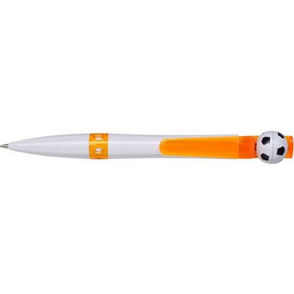 Football ballpen with white barrel, translucent coloured trim and blue ink.