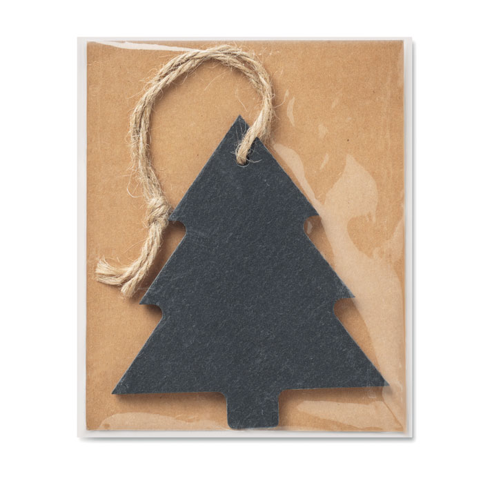 Slate Christmas tree hanging decoration with cord hanger. Printed with logo.