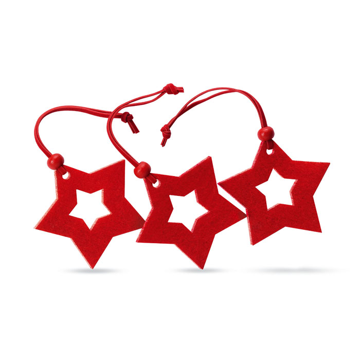 3 piece star shape tree hangers in 3 mm red felt. Printed logo on header card.