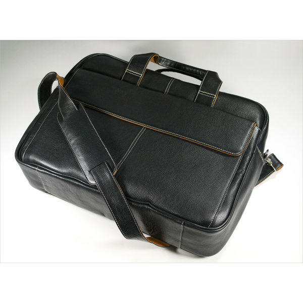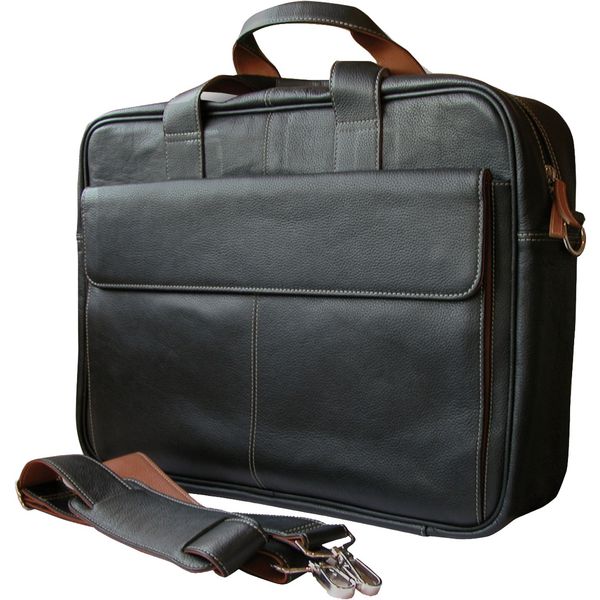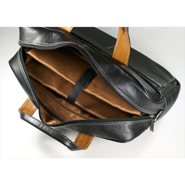 Melbourne Soft Grained Nappa Leather Laptop Bag in black with contrast tan trim. With moden metal fitments, carry handle and removable carry strap