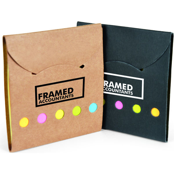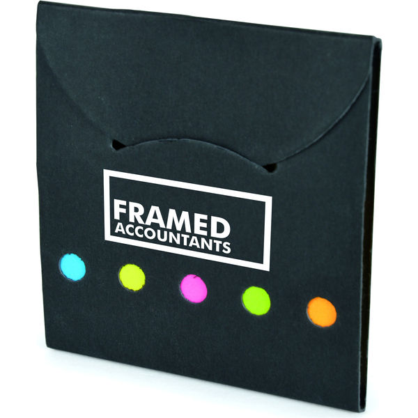 Recycled paper matchbook style sticky note and flag holder. Flags are blue, green, yellow, pink and orange and sticky notes are yellow.