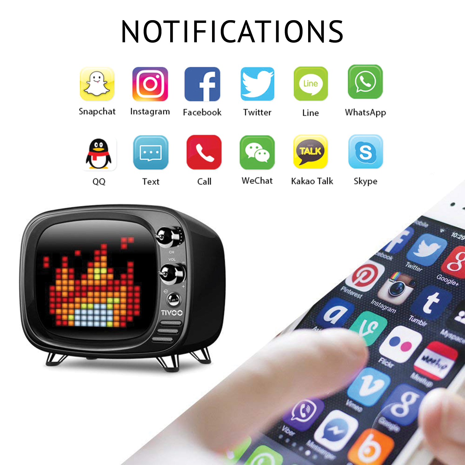 Divoom Tivoo â the new generation pixel art speaker. It features a 16Ã16 full RGB programmable LED panel, an acoustic enhanced design, and a new mobile application. Tivoo is the most unique pixel art smart speaker from Divoom which can be customised with print of up to 2 spot colour or full colour. Latest audio technology & unparalleled tuning experience delivers the finest audio in a compact body. 6W DSP-tuned full range speaker. Creating pixel art has never been easier â draw anything with your fingertip. Upload and share your amazing creations online and view other pixel art fans around the world. 14 refreshing alarm profiles which are highly customisable. Enjoy 24 professional high-quality audio tracks to help with your sleep aid. Record voice message for your family and friends â you can even set your message as the daily alarm.