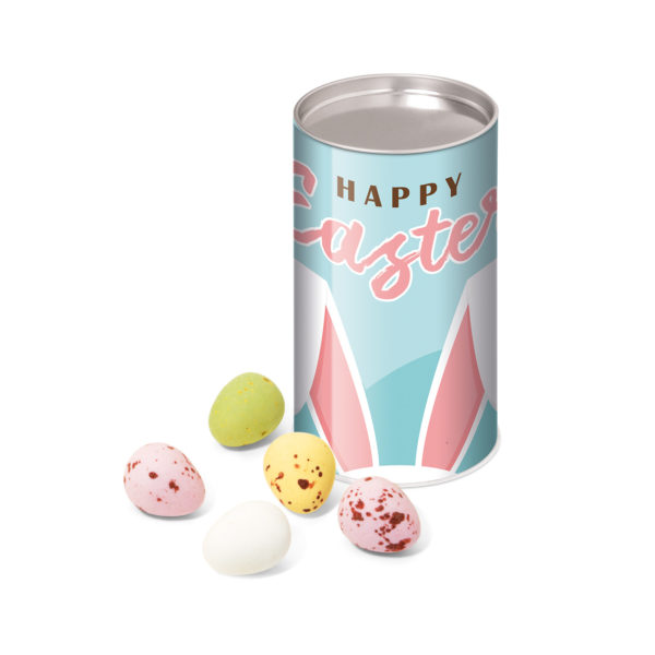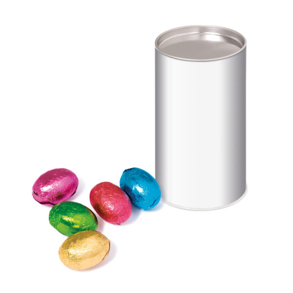 Small card snack tube filled with chocolate Speckled Eggs or foil wrapped chocolate eggs. Branded with a full colour paper wrap to the tube. 90g contents approx.