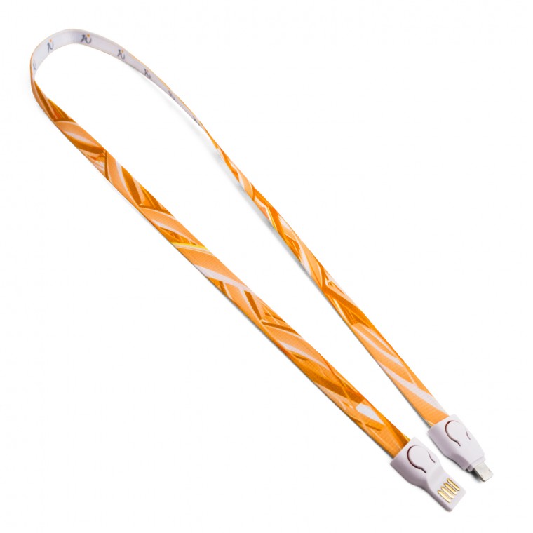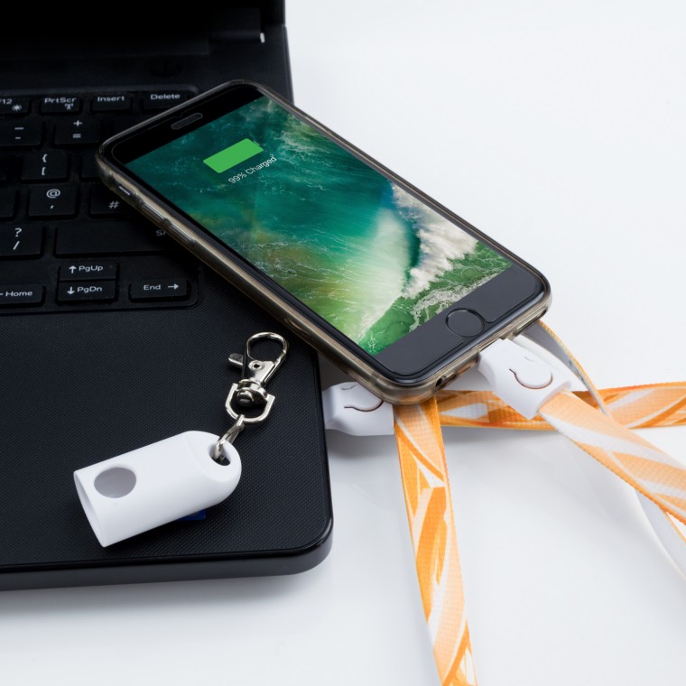 The Smart 2 in 1 Lanyard will be your favourite accessory. Not only a cable that allows charging, but also a wearable lanyard with a strong metal keyring attachment. Thanks to its Nylon finish, the cable is tough and durable, and wont tangle like most standard cables. This cable features a 2-in-1 charging adaptor, for both Lightning and Micro-USB devices. With a large surface area of 930mm x 13mm, print on this product would cover the whole of the lanyard. Full colour flood print allows for a custom finish. White or black finish plastic.