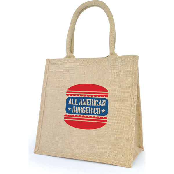 Compact medium sized natural eco friendly jute bag with gusset, rope handles and jute trim. Includes laminated backing.