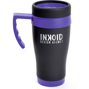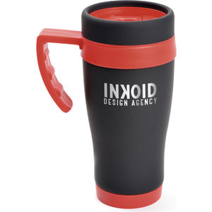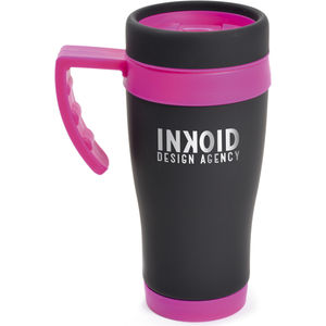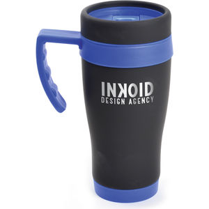 450ml black rubberised stainless steel travel mug with plastic interior. Includes coloured base, handle, top band and lid. Handle is gripped for ease when holding. Conforms to articles in contact with food testing. Logo engraved.