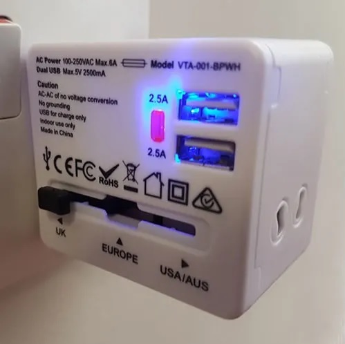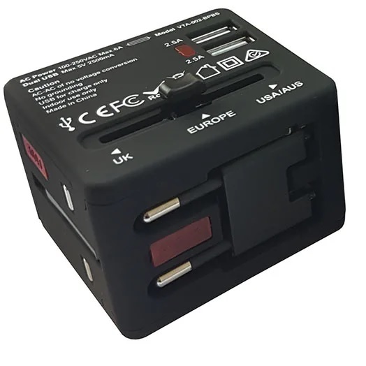 Universal travel adaptor plug powered by VEHO. Over 150 countries. Digitally printed in one position and packed in carry pouch and individual box. Printing on case available at extra cost.