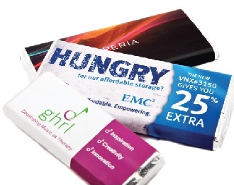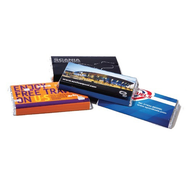 Promotional chocolate bars branded with your own wrapper design printed in full digital colour. Available in 25g, 50g, 80g and 100g bars and in regular or Fairtrade milk chocolate. This low cost promotional product offers extensive branding opportunities with an impressive chocolate thats perfect for all sorts of marketing promotions.