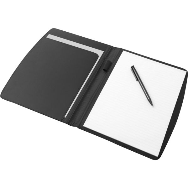 Stylish PVC folder ideal for conferences and events. Black and grey PVC cover with contrast stitching. Elastic pen loops on front and inside. 2 large pockets for notes leaflets etc. Includes A4 lined pad and ballpen..