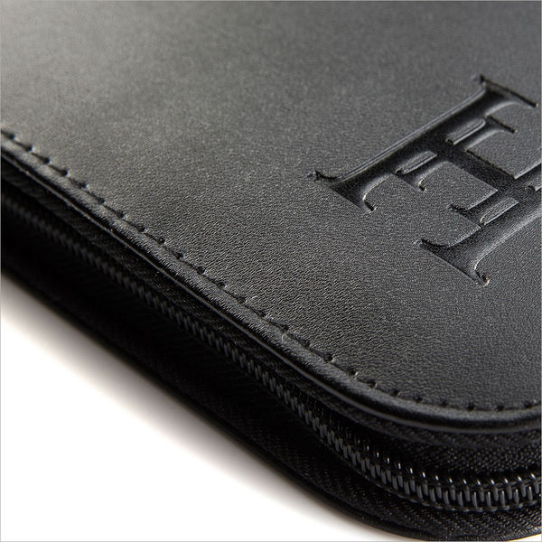 High quality leather look padded and stitched cover, with stitching detail to the spine. Interior includes a business card pocket, pen loop, flash stick loop, ring mechanism and a lined pad. Ideal for embossing, printing or full colour personalisation.