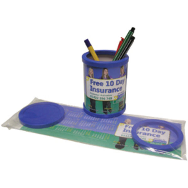 Supplied flat packed, and with generous print areas, a great mail out product. The round pen pot has plastic end caps and cardboard sides and is supplied all packed in a polybag. Printed full colour.