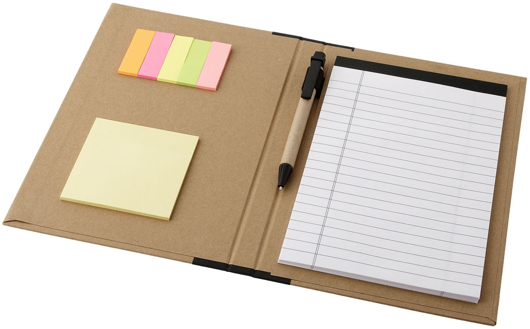 Cardboard portfolio with A5 notepad, pen with matching coloured parts, 5 colour set sticky note markers and 7,5 x 7,5 cm sticky note.