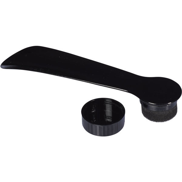 Plastic shoe horn with built in shoe shine. Simply unscrew the circular end of the shoe horn to reveal the shoe shine sponge. Handly, clean and great for the home, office or travel.