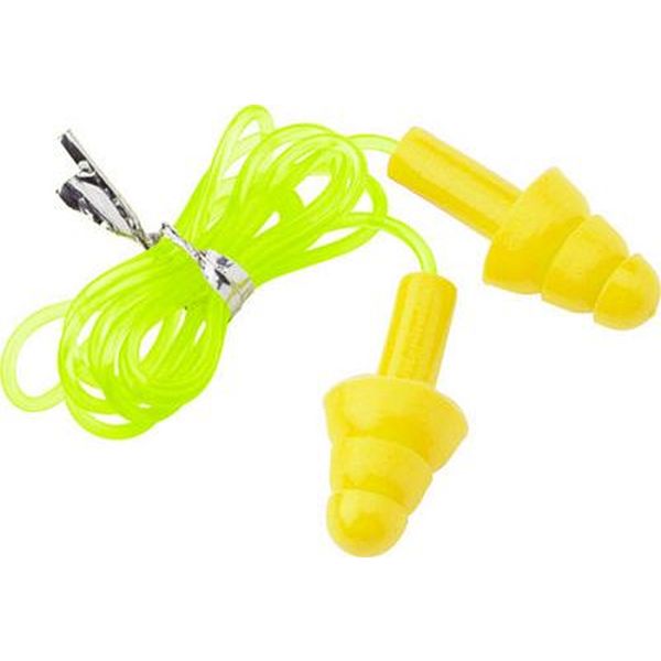 Silicone ear plugs on a nylon cord and presented in a transparent box with belt clip..