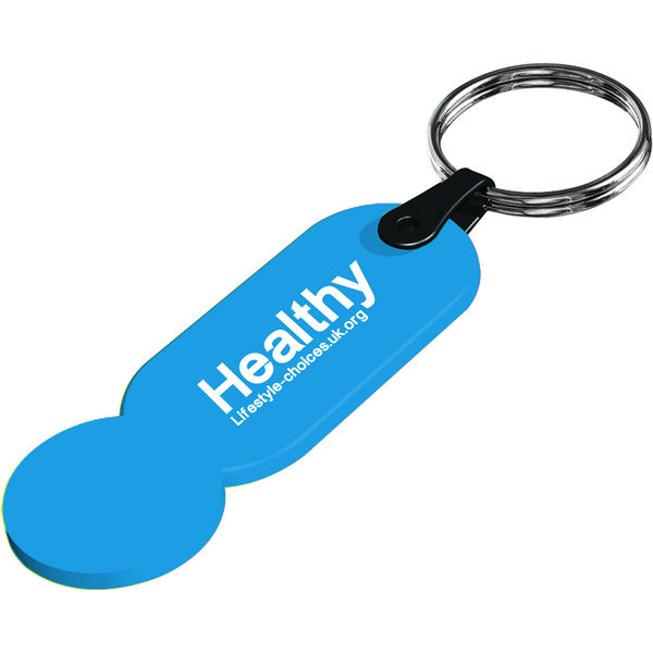 This keyring is a perfect and practical low-cost promotional keyring. With a coin shaped area at one end, and a large branding area at the other, its a great way to get your brand seen during the weekly shop and much more! Made in Britain, its available in a wide range of colours to match your brand.
