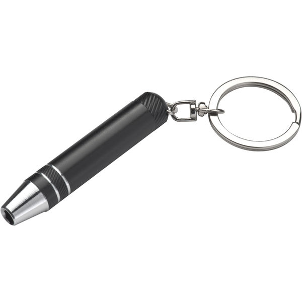 Screwdriver pen made of aluminum with keyring and three different bits, which are practically stored in the screwable cap. We will engrave your advertising on the shaft.