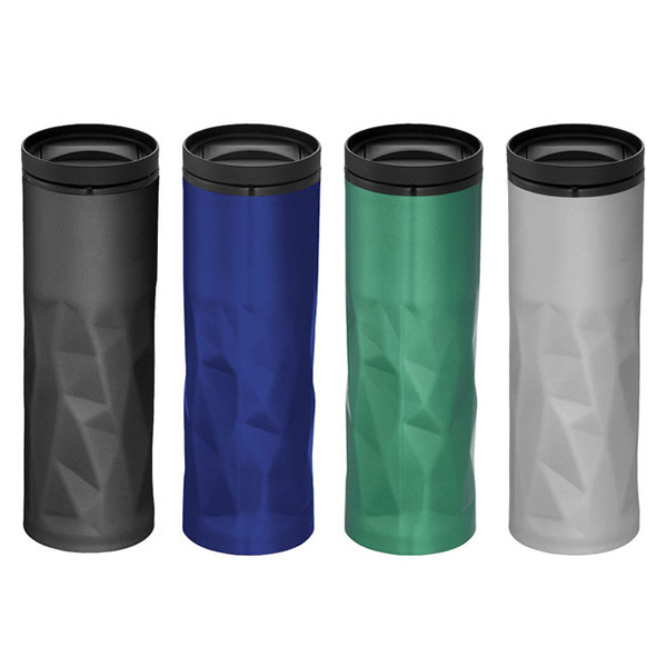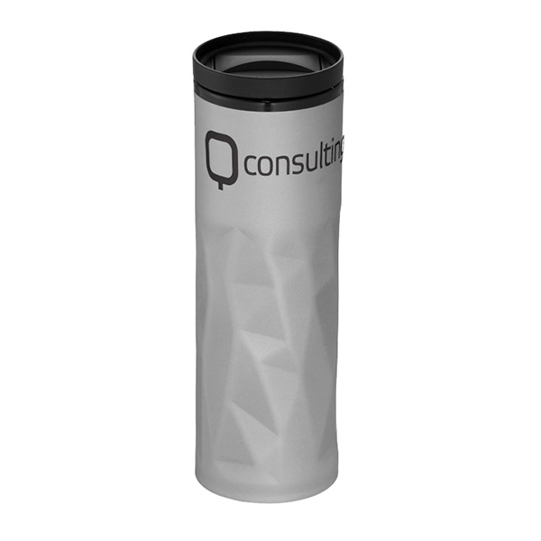 Double-walled tumbler with attractive geometric design and twist-on slide-lock lid. Volume capacity is 450 ml.