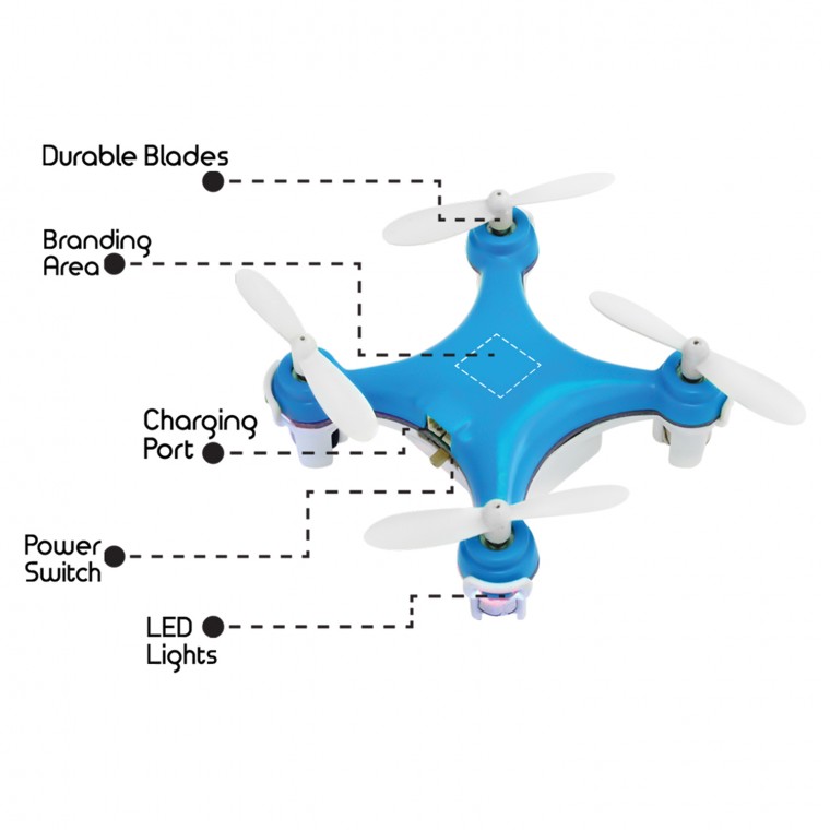 Catch everyone's attention with the Smart minidrone; whether you're flying or flipping, you'll have endless fun! Featuring four motor blades, the minidrone is quick and capable; with a press of the analogue stick, the drone can be switched into three different speed modes, or flip mode! With a smooth ABS material, the top of the minidrone's surface can be printed 1-2 spot colour for a bespoke finish. Flight time: 4 minutes, remote distance: 30m, batteries not included.