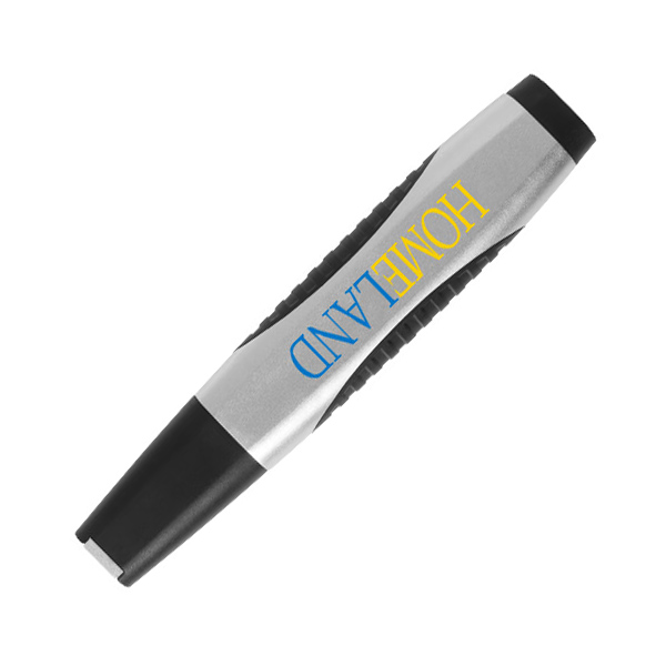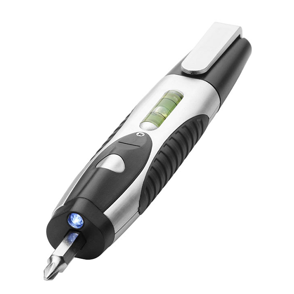 Compact screwdriver with big and small Philips head, big and small slot head, spirit level and a LED light with on/off power switch. Battery included. Plastic