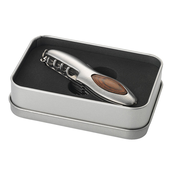 Metal 15-function knife enriched with a wooden inlay. Includes tin gift box.