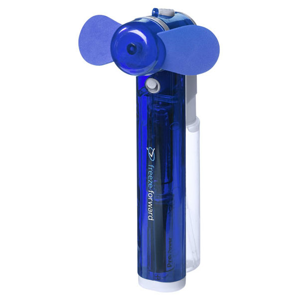 Pocket fan with small water container & spray for extra relief from the heat. 2x AA batteries included. PS & PP plastic.
