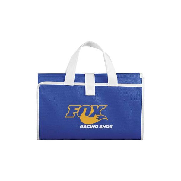 Sand Dune beach mat. Folding beach mat with double reinforced handles. Velcro? strap closure to make item portable when not in use as mat. 80g Non-Woven Polypropylene.