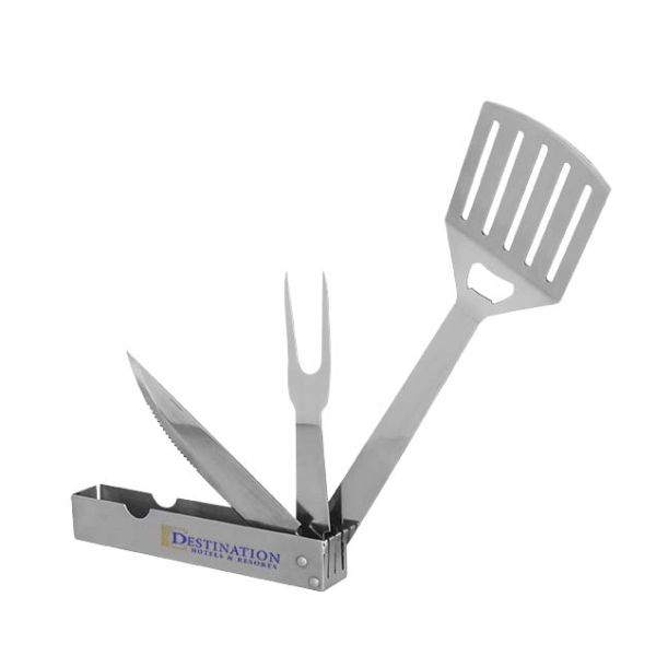 Cove 3-in-1 foldable BBQ tool. Folding BBQ tool, which holds a two-prong meat fork, a serrated knife and spatula. The tools can be folded into the long handle for economical storage. Allows quick access to the utensil you need. Presented in a Seasons gift box. Exclusive design. Stainless steel. 465.