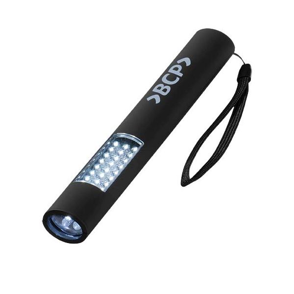 Magnetic 28 LED torch. Slim and magnetic torch which has three modes. The first mode is a 4 LED flashlight, the second mode is the 24 LED light, and the third mode is both on at once. Magnetic back for easy storage or for placement against metal surfaces when in use. Push button on/off. Nylon carrying strap. Packed in a STAC gift box. Batteries included and inserted. Exclusive design. ABS plastic with soft touch coating.