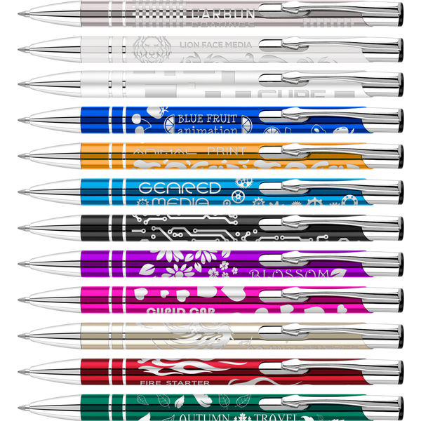 Attractive aluminium push button ballpen with lacquer finish and chrome trim. The popular Electra ballpen but can be engraved with your logo, message or design 360 degrees around the barrel and certain to make impact. Black ink refill.